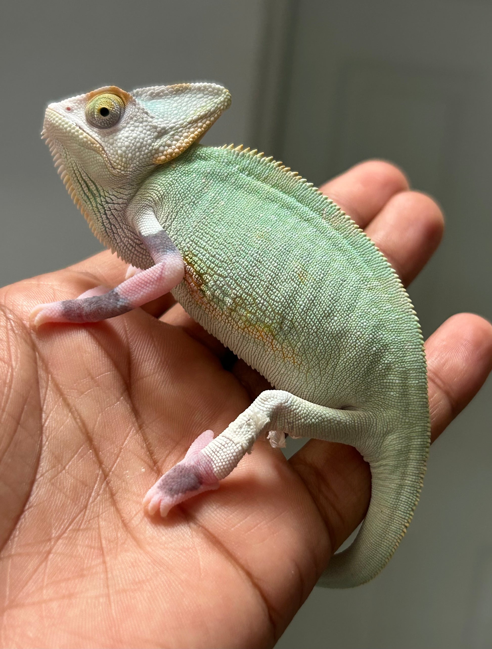 Este es un camaleón de velo (Chamaeleo calyptratus) de fase “High Pied” macho juvenil.