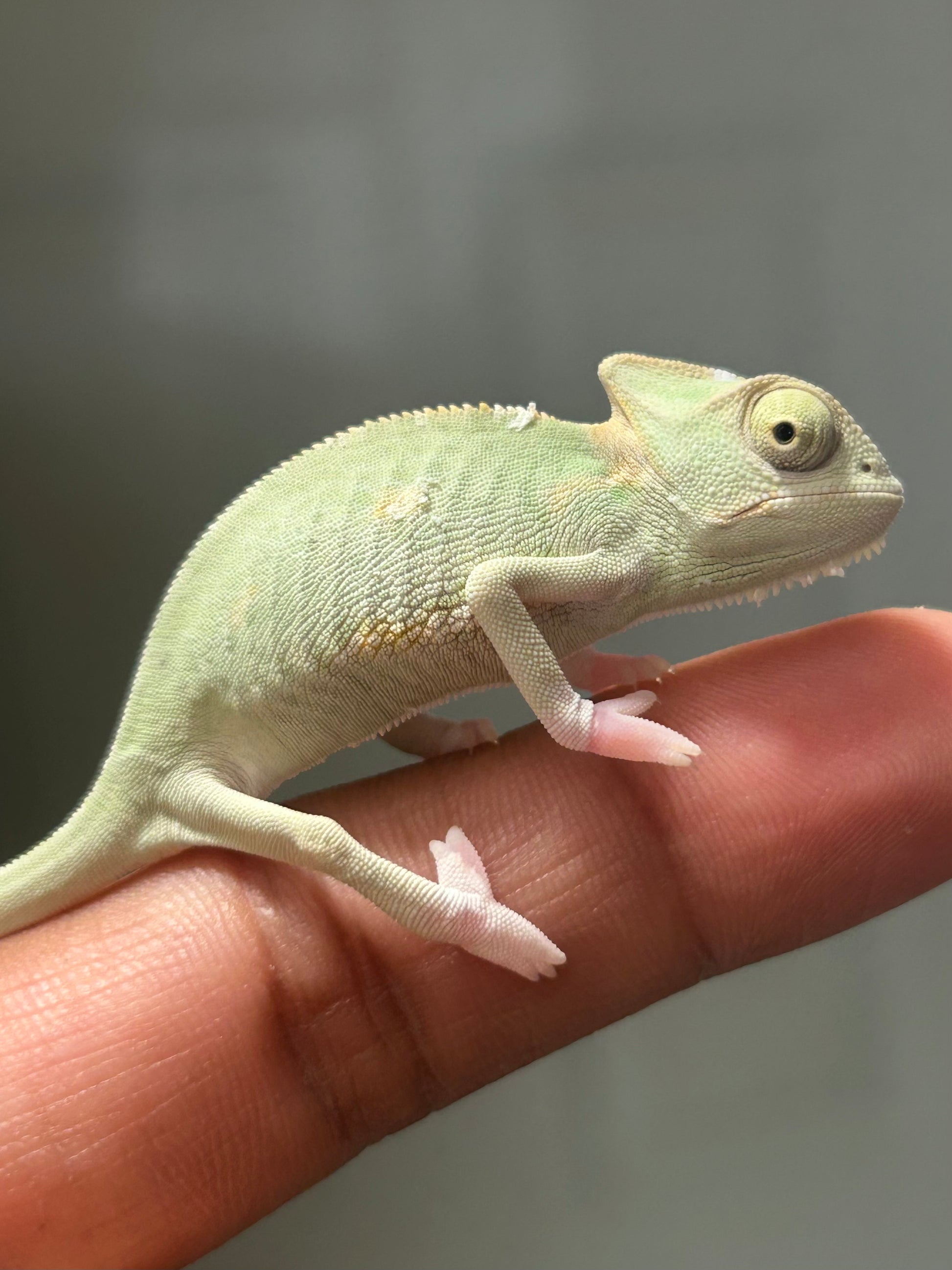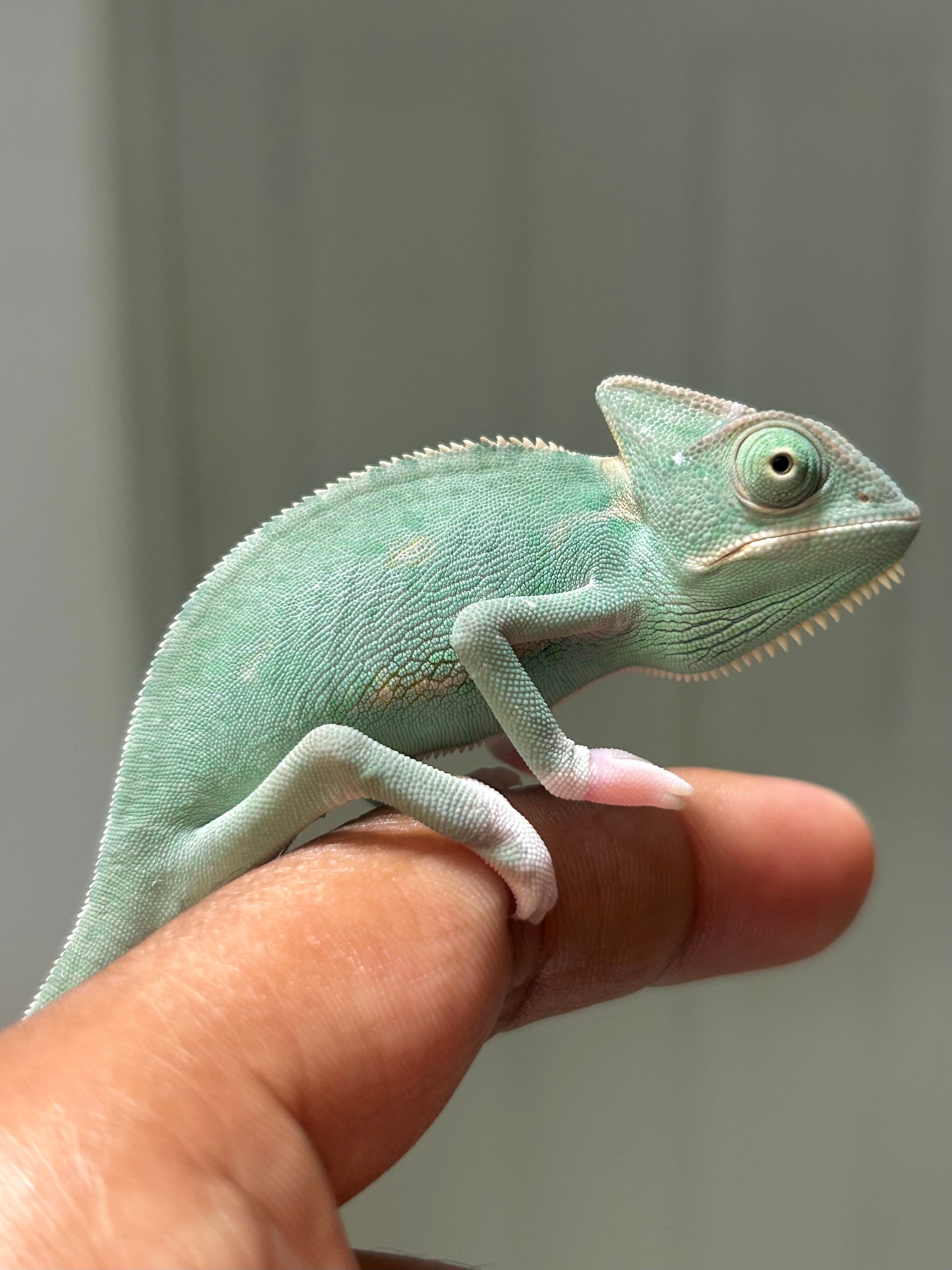 Este es un camaleón de velo (Chamaeleo calyptratus) de fase low pied hembra cría.