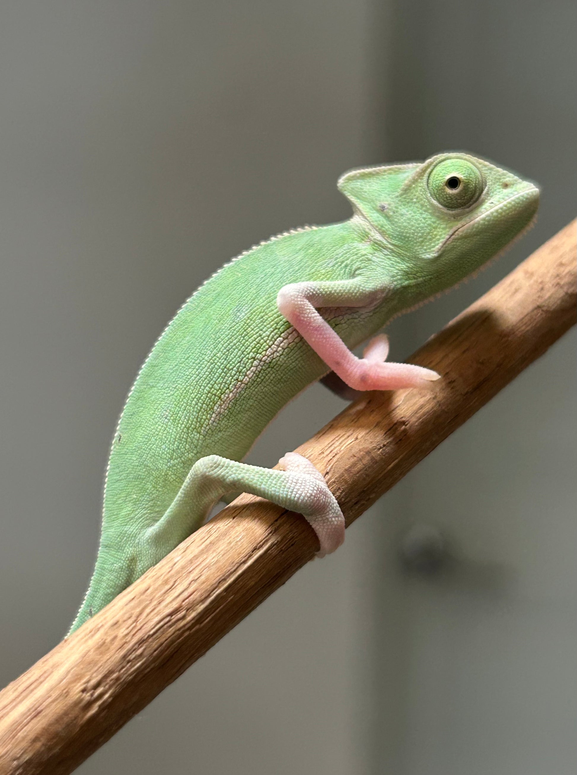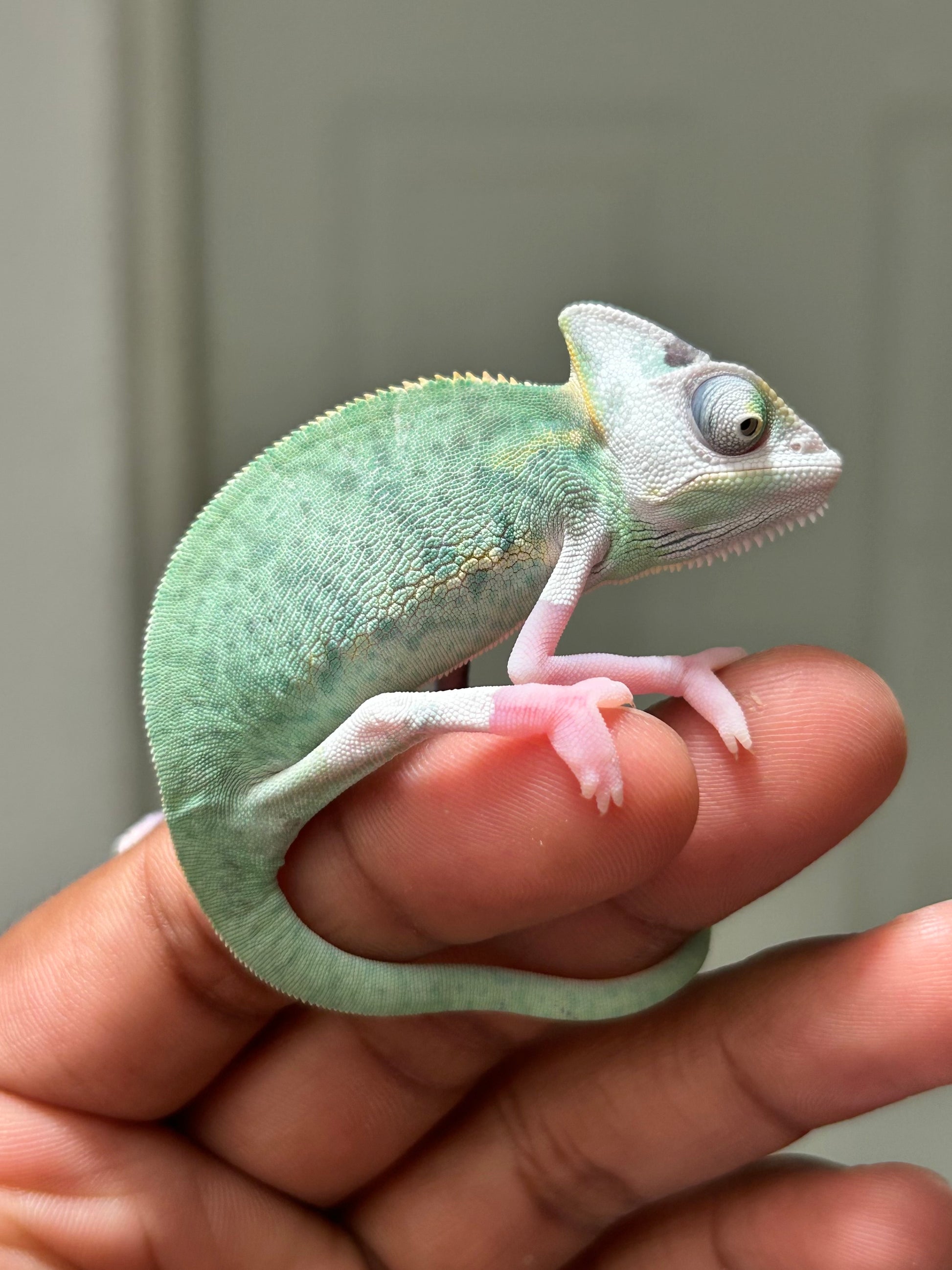 Este es un camaleón de velo (Chamaeleo calyptratus) de fase High Pied hembra cría.