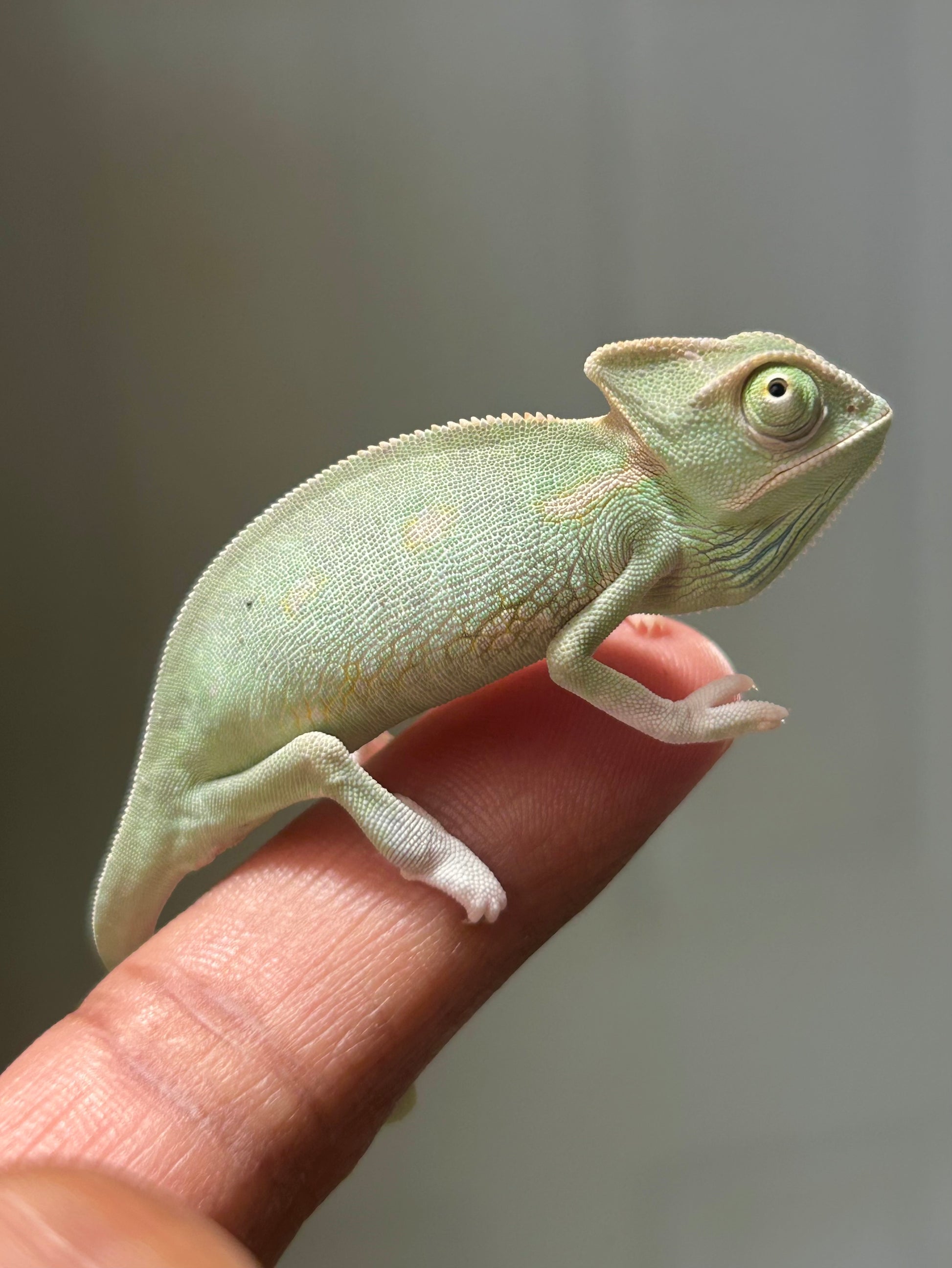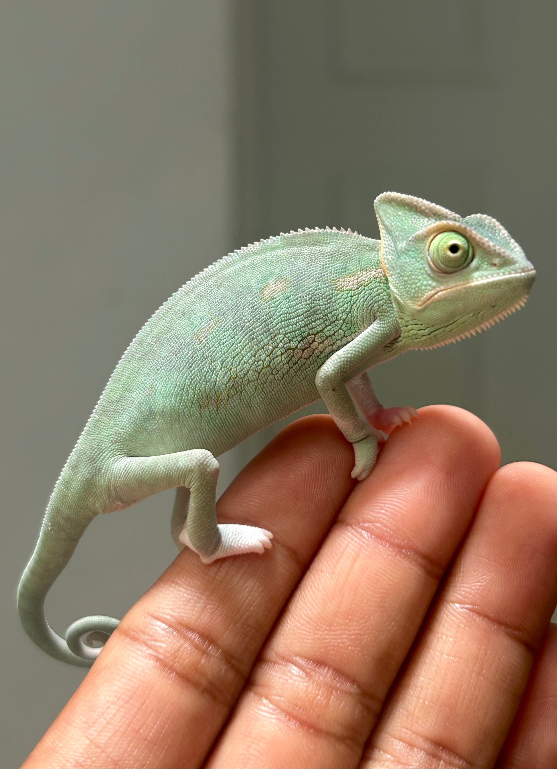 Este es un camaleón de velo (Chamaeleo calyptratus) de fase low pied macho cría.