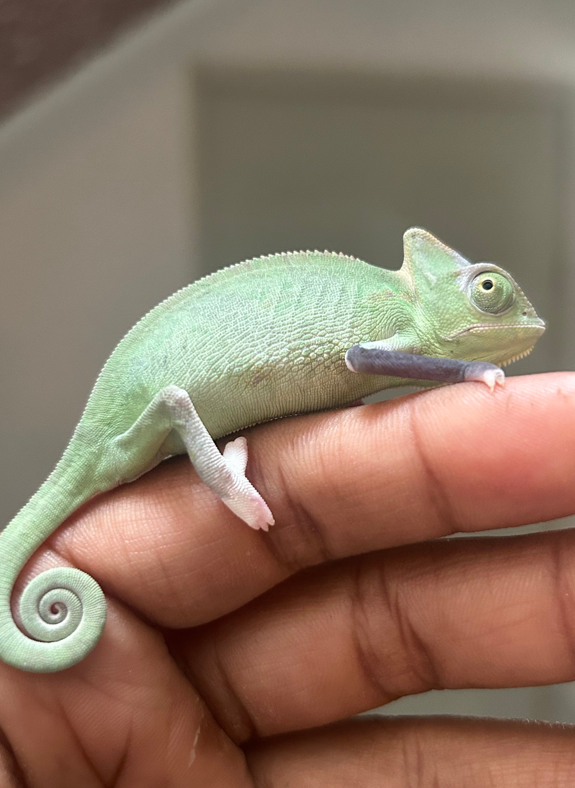 Este es un camaleón de velo (Chamaeleo calyptratus) de fase High Pied hembra cría.