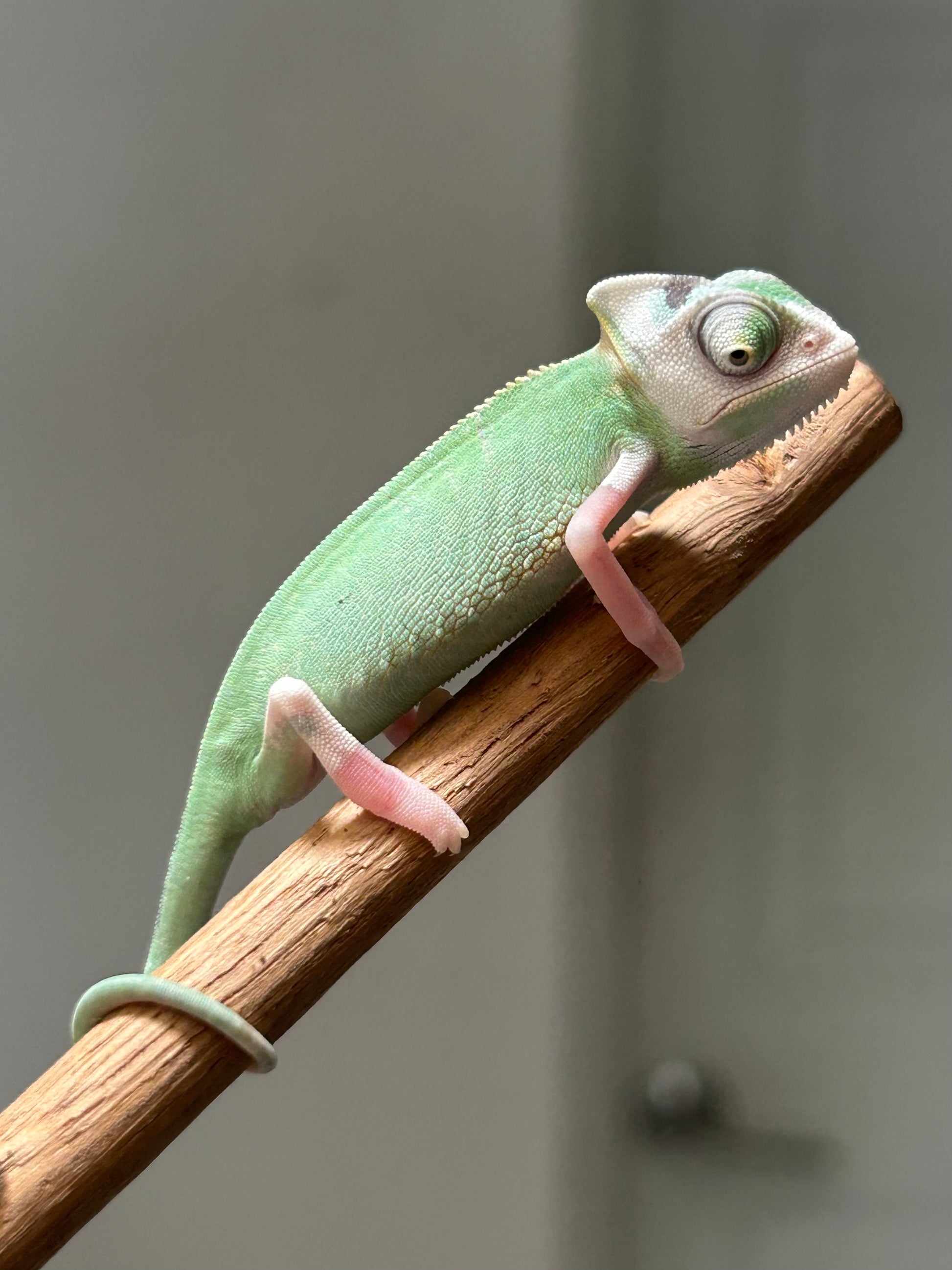 Este es un camaleón de velo (Chamaeleo calyptratus) de fase High Pied hembra cría.