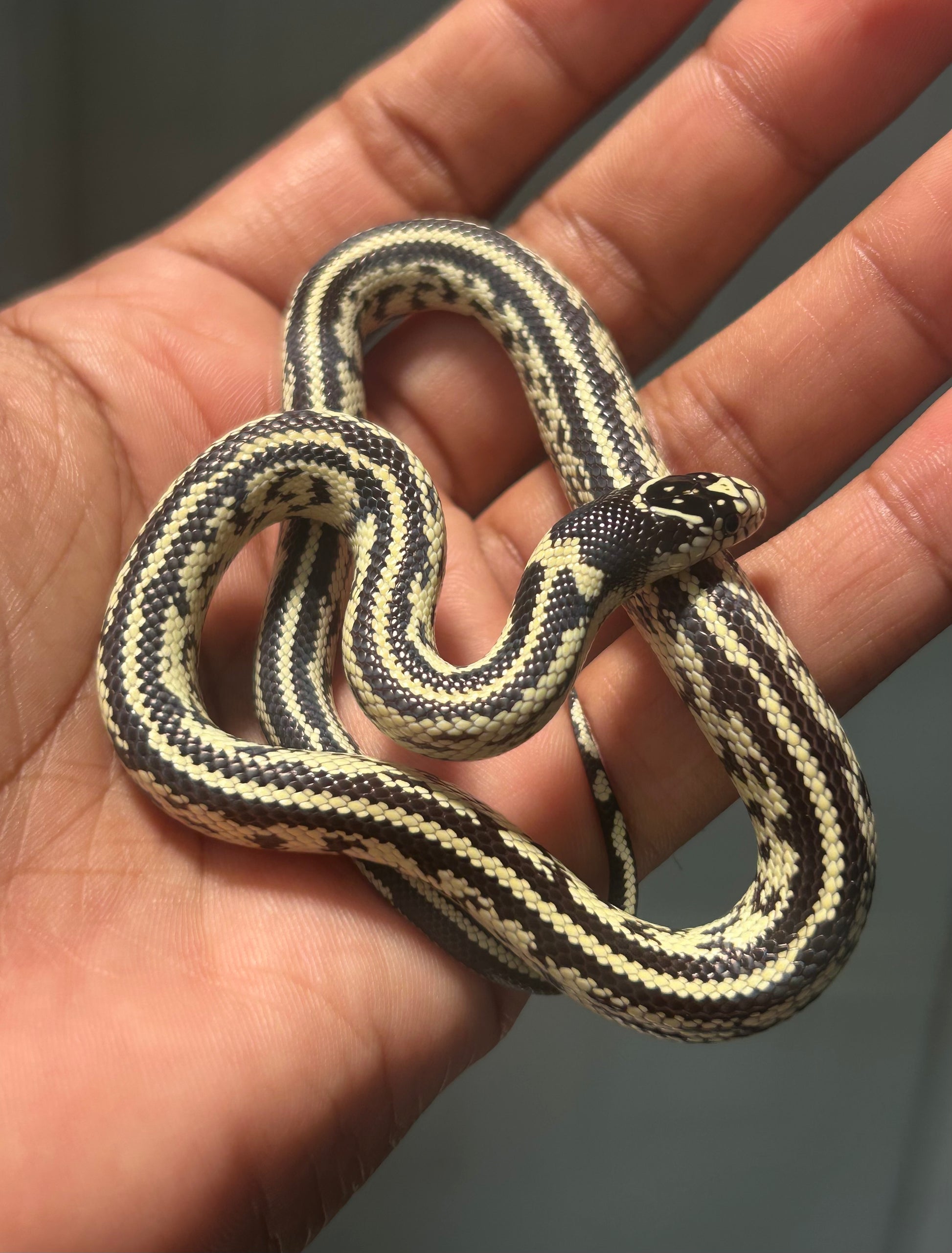 Esta es una serpiente Rey de California (Lampropeltis californiae) aberrante macho cría, alimentándose de pinkies de ratón semanalmente.