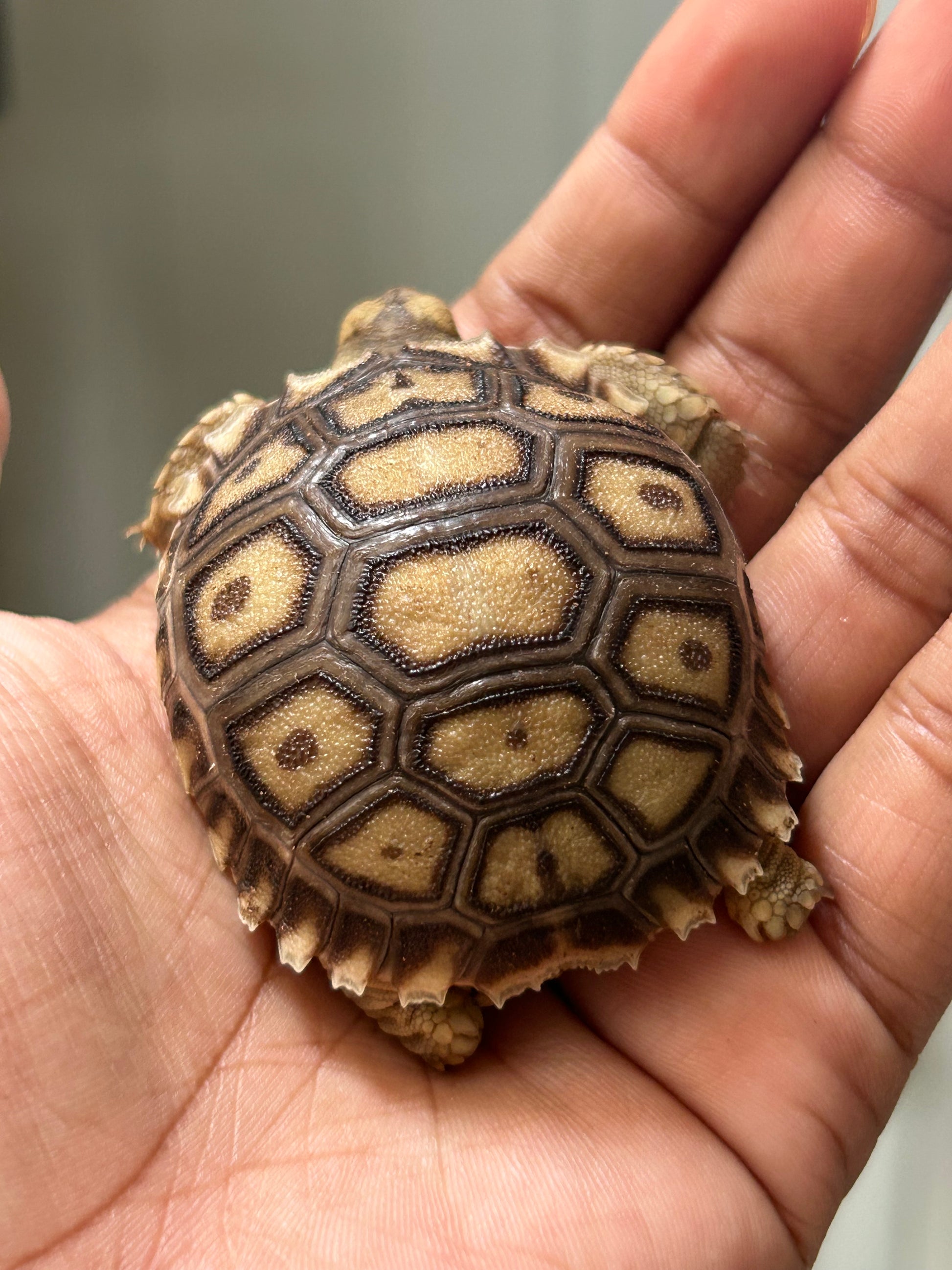 Este es un ejemplar de Tortuga sulcata (Centrochelys sulcata) cría sin sexar.
